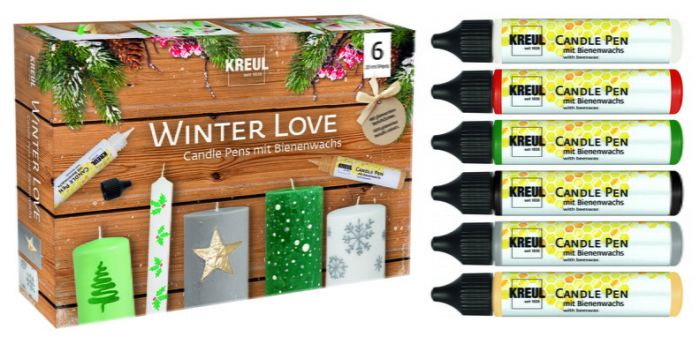 Enchanted landscapes outside, a cozy atmosphere inside – winter is simply magical. Let’s celebrate it with the KREUL Candle Pen Set of 6 Winter Love. The mix of cool and heartwarming colours can be used to paint candles to make eye-catching winter decorations. A fantastic way to create a stylish ambience in no time at all because the handy pen makes the candle paints so easy to use. Winter is a special time – let’s enjoy it by candlelight.