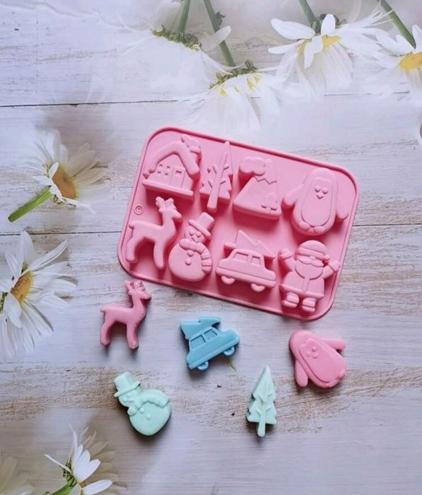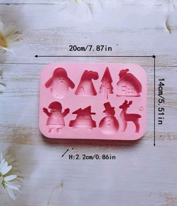 An 8-cavity silicone mold featuring Christmas-themed shapes, including a tree, house, reindeer, Santa Claus, mountain, car, penguin and snowman, perfect for creating a festive variety of candles, soaps, or decorations.