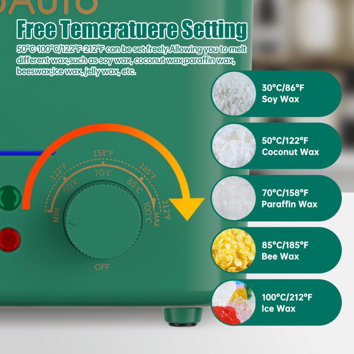 With a temperature dial ranging from 30°C to 100°C, it can meet various needs for melting different types of wax such as soy wax, beeswax, paraffin, coconut wax, and more. Once set, the temperature is automatically and constantly regulated, ensuring that your wax is melted to perfection every time, allowing you to manufacture more candles efficiently and in less time. The melter can melt 1.5kg of soy wax in approximately 20 minutes when set to 100°C, but the temperature dial should be lowered down once it is melted. Heating core spout technology: say no to clogged spouts. The patented spout technology keeps the wax heated and runs through the spout, avoiding any potential blockages. The spout is located lower and allows 98% of the wax to be easily drained. It is easy to clean, but be extra careful and make sure it is completely cool before doing so. (Caution: make sure you always have enough wax in the melter to completely cover the floor of the basin when in use). Whether you're making candles, soap, or any other wax-based product, the Automatic Wax Melter will help make the process faster, smoother, and more enjoyable. Temperature: up to 100°C Certifications: CE, EMC, LVD, FCC. ***CAUTION HOT SURFACE*** |